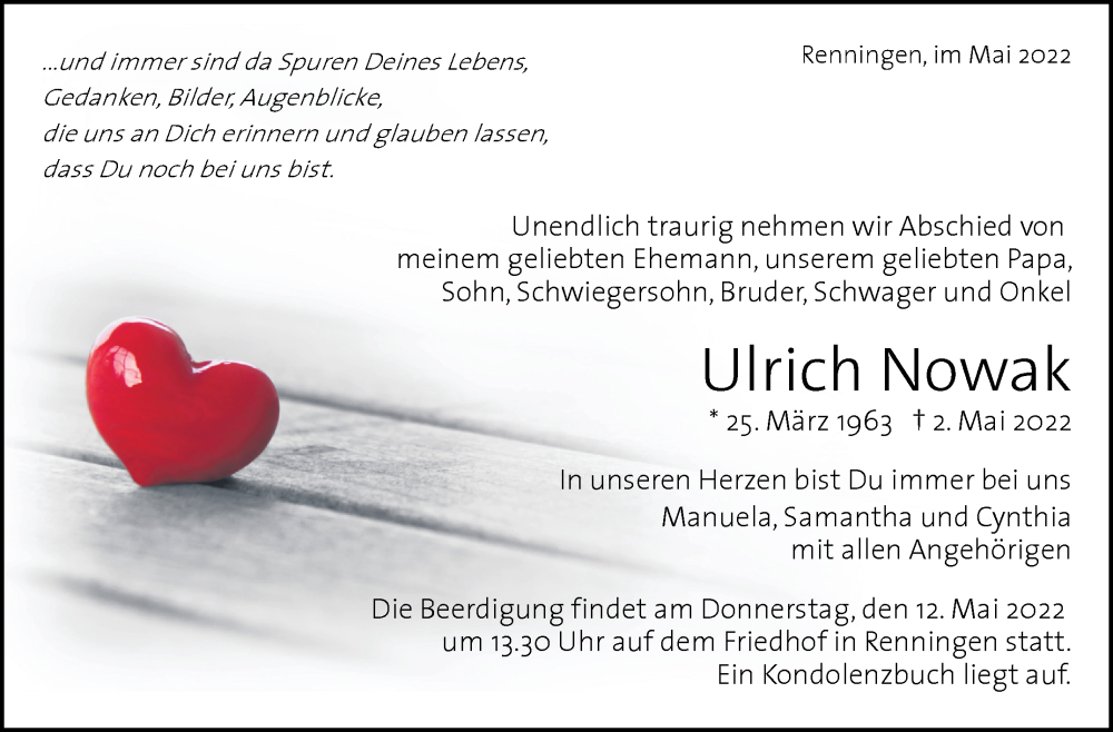 Hier finden Sie alle Traueranzeigen aus der Zeitung, die bisher für Ulrich Nowak erschienen sind. Weitere Traueranzeigen, die in der Zeitung erscheinen, werden hier ebenfalls aufgelistet