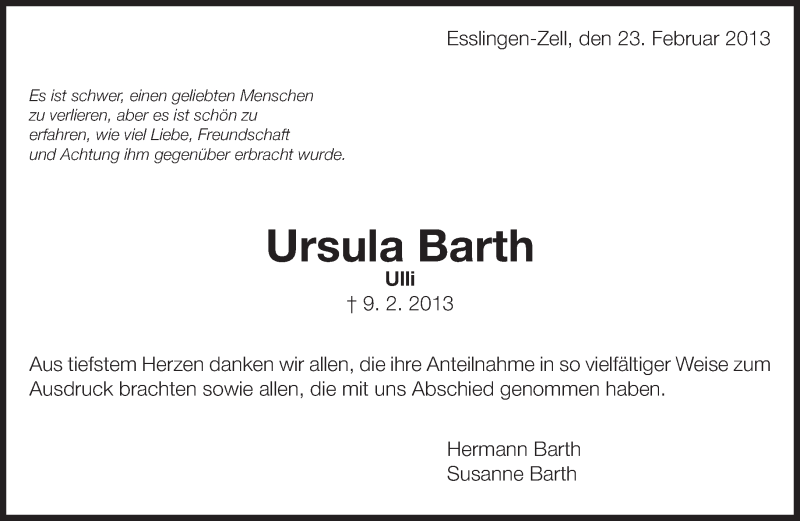 Hier finden Sie alle Traueranzeigen aus der Zeitung, die bisher für Ursula Barth erschienen sind. Weitere Traueranzeigen, die in der Zeitung erscheinen, werden hier ebenfalls aufgelistet