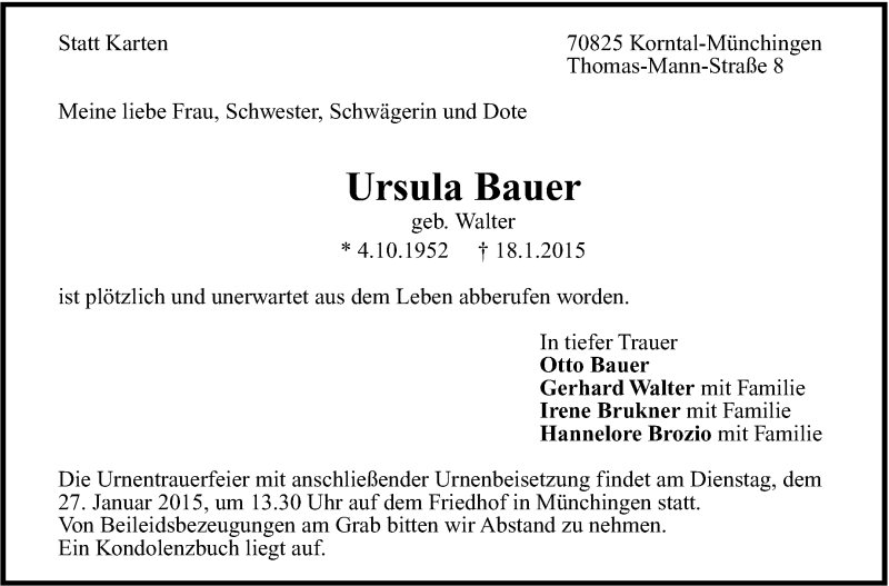 Hier finden Sie alle Traueranzeigen aus der Zeitung, die bisher für Ursula Bauer erschienen sind. Weitere Traueranzeigen, die in der Zeitung erscheinen, werden hier ebenfalls aufgelistet