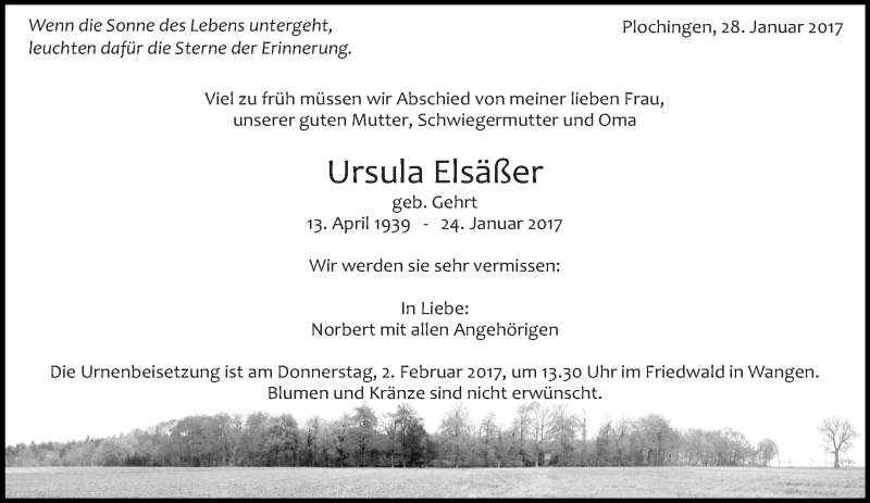Hier finden Sie alle Traueranzeigen aus der Zeitung, die bisher für Ursula Elsäßer erschienen sind. Weitere Traueranzeigen, die in der Zeitung erscheinen, werden hier ebenfalls aufgelistet