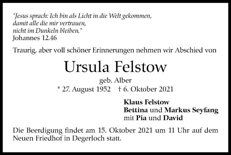 Hier finden Sie alle Traueranzeigen aus der Zeitung, die bisher für Ursula Felstow erschienen sind. Weitere Traueranzeigen, die in der Zeitung erscheinen, werden hier ebenfalls aufgelistet