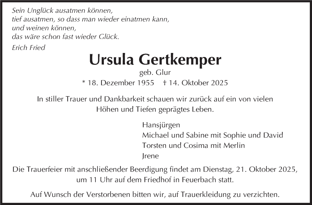 Hier finden Sie alle Traueranzeigen aus der Zeitung, die bisher für Ursula Gertkemper erschienen sind. Weitere Traueranzeigen, die in der Zeitung erscheinen, werden hier ebenfalls aufgelistet
