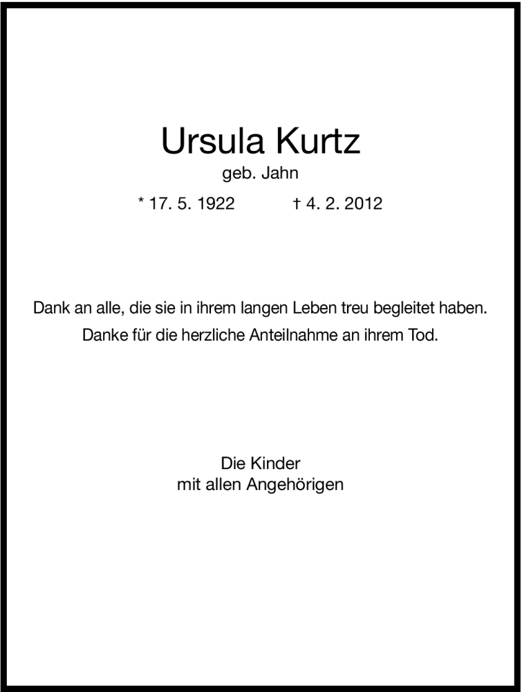 Hier finden Sie alle Traueranzeigen aus der Zeitung, die bisher für Ursula Kurz erschienen sind. Weitere Traueranzeigen, die in der Zeitung erscheinen, werden hier ebenfalls aufgelistet
