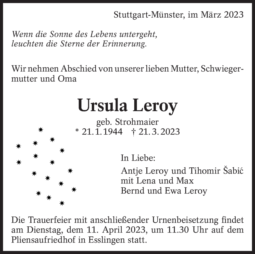 Hier finden Sie alle Traueranzeigen aus der Zeitung, die bisher für Ursula Leroy erschienen sind. Weitere Traueranzeigen, die in der Zeitung erscheinen, werden hier ebenfalls aufgelistet