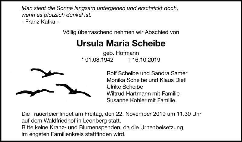 Hier finden Sie alle Traueranzeigen aus der Zeitung, die bisher für Ursula Maria Scheibe erschienen sind. Weitere Traueranzeigen, die in der Zeitung erscheinen, werden hier ebenfalls aufgelistet