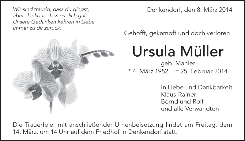Hier finden Sie alle Traueranzeigen aus der Zeitung, die bisher für Ursula Müller erschienen sind. Weitere Traueranzeigen, die in der Zeitung erscheinen, werden hier ebenfalls aufgelistet