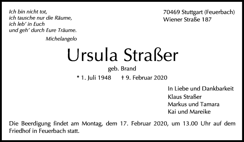 Hier finden Sie alle Traueranzeigen aus der Zeitung, die bisher für Ursula Straßer erschienen sind. Weitere Traueranzeigen, die in der Zeitung erscheinen, werden hier ebenfalls aufgelistet