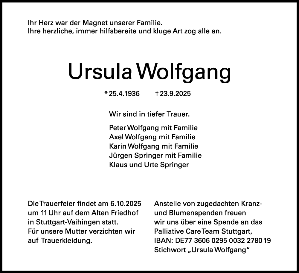 Hier finden Sie alle Traueranzeigen aus der Zeitung, die bisher für Ursula Wolfgang erschienen sind. Weitere Traueranzeigen, die in der Zeitung erscheinen, werden hier ebenfalls aufgelistet