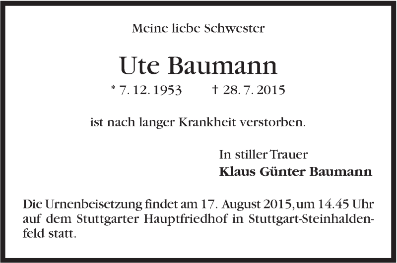 Hier finden Sie alle Traueranzeigen aus der Zeitung, die bisher für Ute Baumann erschienen sind. Weitere Traueranzeigen, die in der Zeitung erscheinen, werden hier ebenfalls aufgelistet