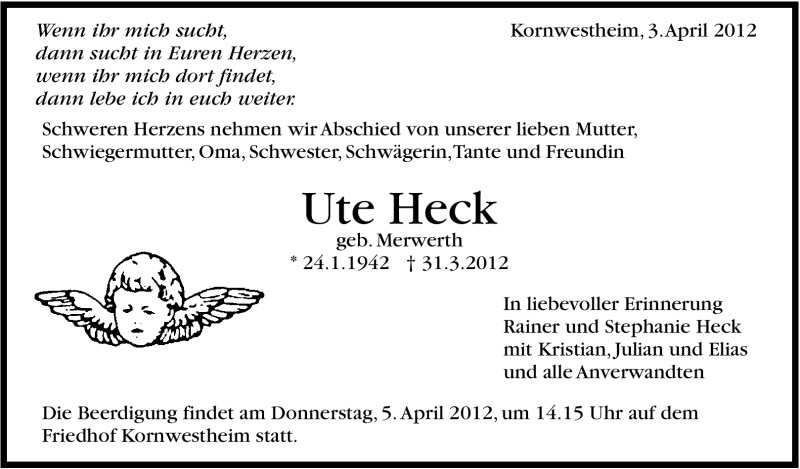 Hier finden Sie alle Traueranzeigen aus der Zeitung, die bisher für Ute Heck erschienen sind. Weitere Traueranzeigen, die in der Zeitung erscheinen, werden hier ebenfalls aufgelistet