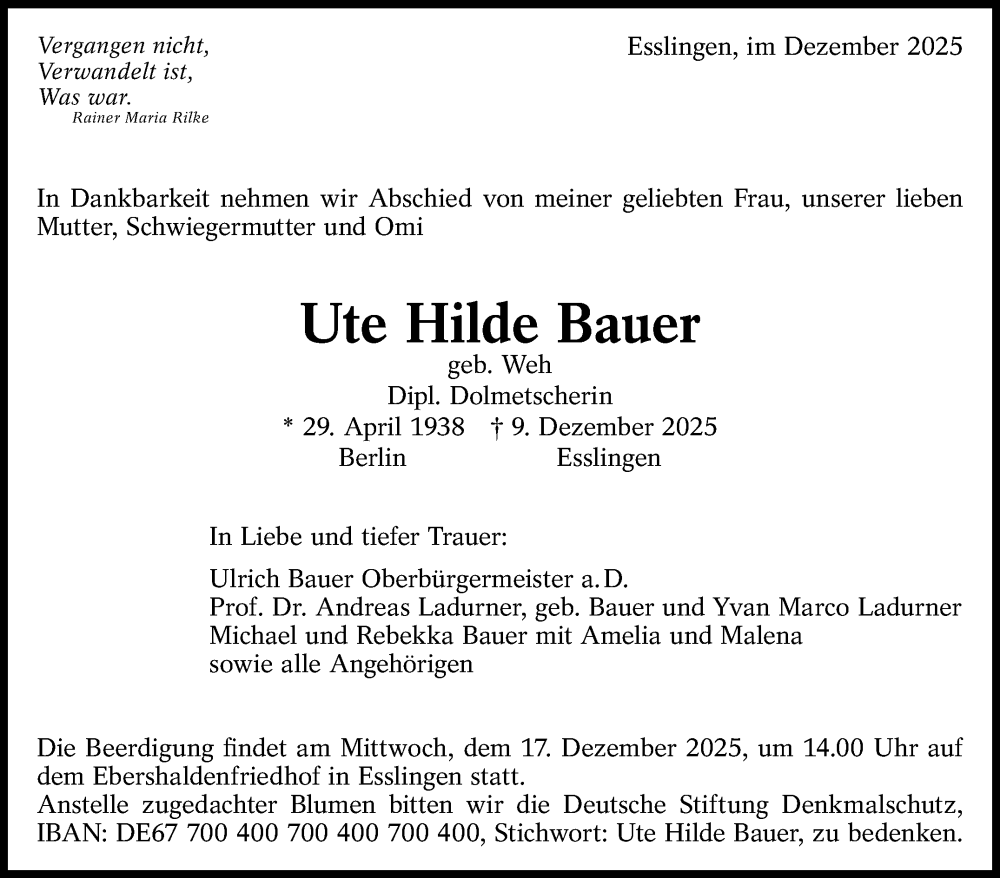 Hier finden Sie alle Traueranzeigen aus der Zeitung, die bisher für Ute Hilde Bauer erschienen sind. Weitere Traueranzeigen, die in der Zeitung erscheinen, werden hier ebenfalls aufgelistet