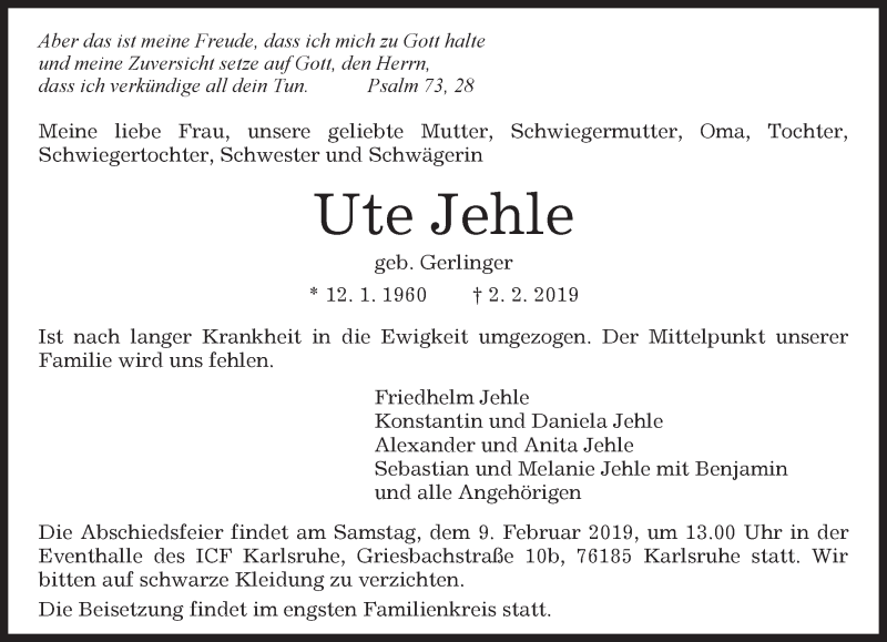 Hier finden Sie alle Traueranzeigen aus der Zeitung, die bisher für Ute Jehle erschienen sind. Weitere Traueranzeigen, die in der Zeitung erscheinen, werden hier ebenfalls aufgelistet