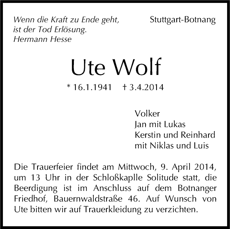 Hier finden Sie alle Traueranzeigen aus der Zeitung, die bisher für Ute Wolf erschienen sind. Weitere Traueranzeigen, die in der Zeitung erscheinen, werden hier ebenfalls aufgelistet