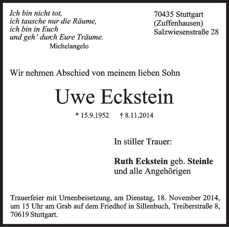 Hier finden Sie alle Traueranzeigen aus der Zeitung, die bisher für Uwe Eckstein erschienen sind. Weitere Traueranzeigen, die in der Zeitung erscheinen, werden hier ebenfalls aufgelistet