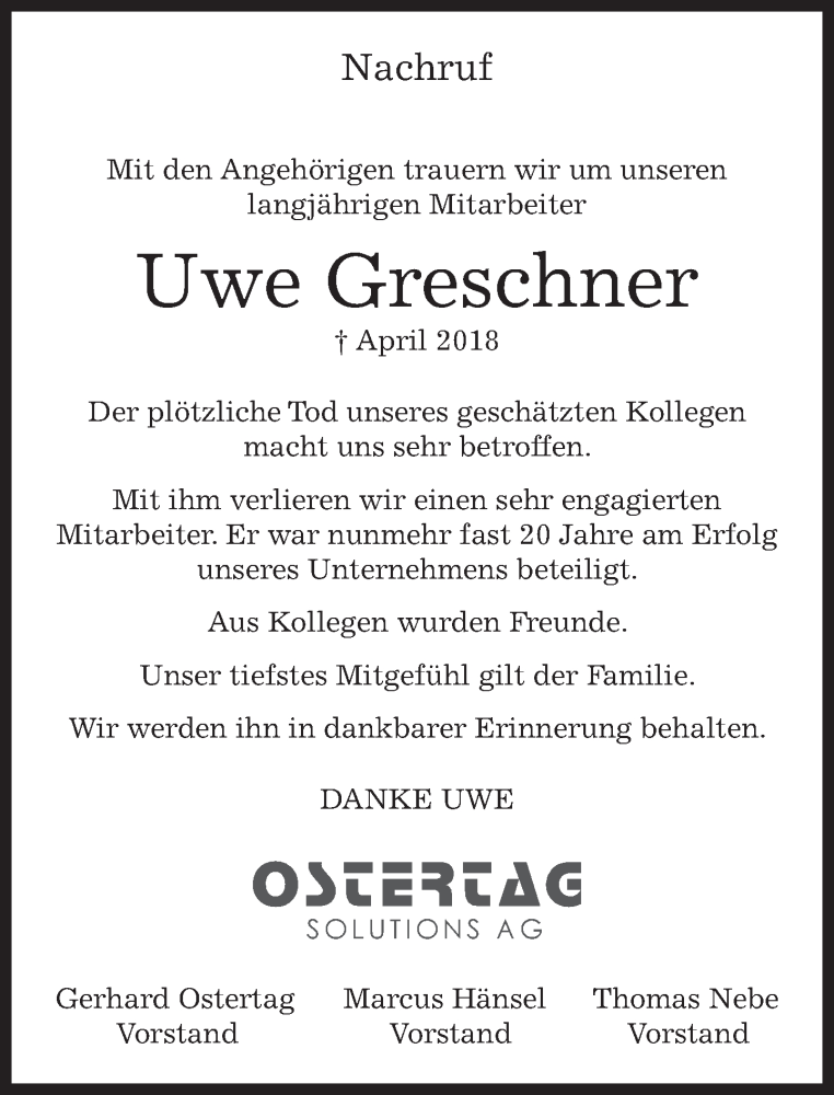 Hier finden Sie alle Traueranzeigen aus der Zeitung, die bisher für Uwe Greschner erschienen sind. Weitere Traueranzeigen, die in der Zeitung erscheinen, werden hier ebenfalls aufgelistet