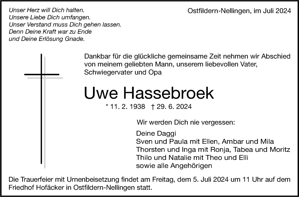 Hier finden Sie alle Traueranzeigen aus der Zeitung, die bisher für Uwe Hassebroek erschienen sind. Weitere Traueranzeigen, die in der Zeitung erscheinen, werden hier ebenfalls aufgelistet