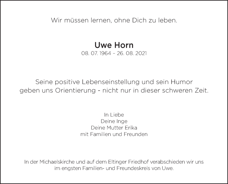 Hier finden Sie alle Traueranzeigen aus der Zeitung, die bisher für Uwe Horn erschienen sind. Weitere Traueranzeigen, die in der Zeitung erscheinen, werden hier ebenfalls aufgelistet