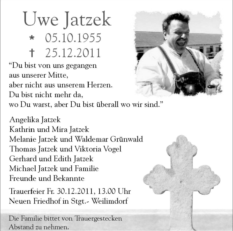Hier finden Sie alle Traueranzeigen aus der Zeitung, die bisher für Uwe Jatzek erschienen sind. Weitere Traueranzeigen, die in der Zeitung erscheinen, werden hier ebenfalls aufgelistet