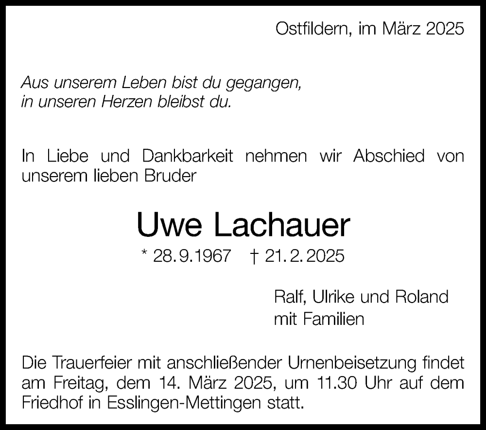 Hier finden Sie alle Traueranzeigen aus der Zeitung, die bisher für Uwe Lachauer erschienen sind. Weitere Traueranzeigen, die in der Zeitung erscheinen, werden hier ebenfalls aufgelistet