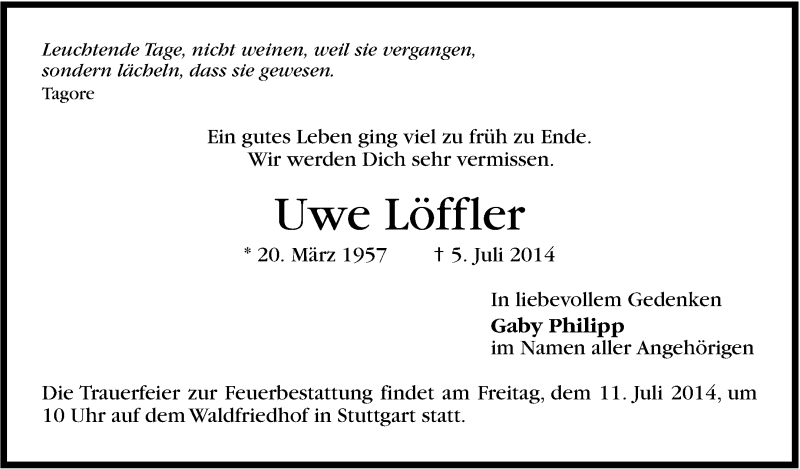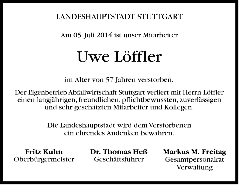 Hier finden Sie alle Traueranzeigen aus der Zeitung, die bisher für Uwe Löffler erschienen sind. Weitere Traueranzeigen, die in der Zeitung erscheinen, werden hier ebenfalls aufgelistet