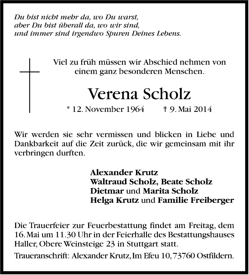 Hier finden Sie alle Traueranzeigen aus der Zeitung, die bisher für Verena Scholz erschienen sind. Weitere Traueranzeigen, die in der Zeitung erscheinen, werden hier ebenfalls aufgelistet