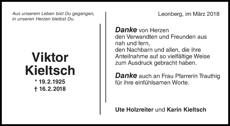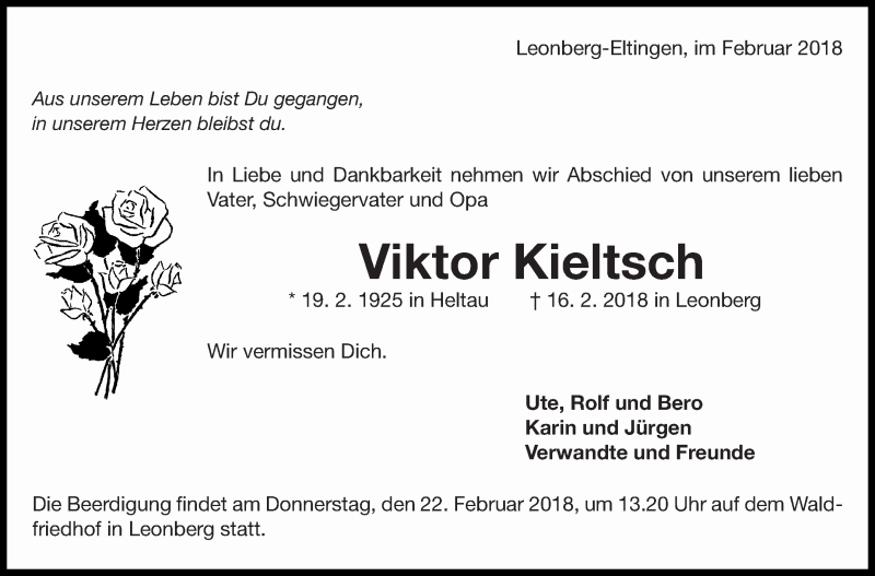 Hier finden Sie alle Traueranzeigen aus der Zeitung, die bisher für Viktor Kieltsch erschienen sind. Weitere Traueranzeigen, die in der Zeitung erscheinen, werden hier ebenfalls aufgelistet