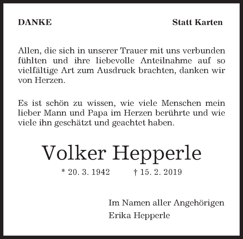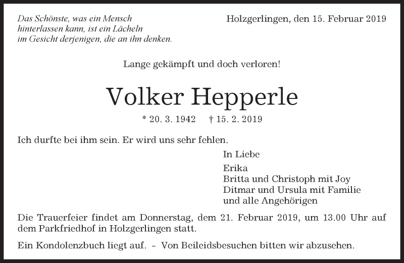 Hier finden Sie alle Traueranzeigen aus der Zeitung, die bisher für Volker Hepperle erschienen sind. Weitere Traueranzeigen, die in der Zeitung erscheinen, werden hier ebenfalls aufgelistet
