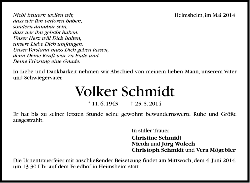 Hier finden Sie alle Traueranzeigen aus der Zeitung, die bisher für Volker Schmidt erschienen sind. Weitere Traueranzeigen, die in der Zeitung erscheinen, werden hier ebenfalls aufgelistet