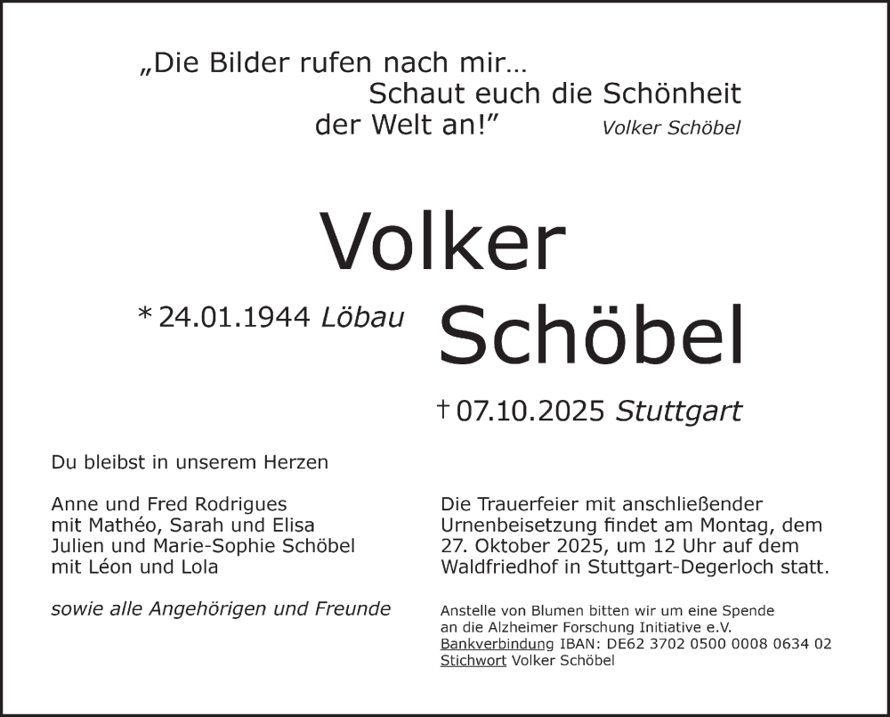 Hier finden Sie alle Traueranzeigen aus der Zeitung, die bisher für Volker Schöbel erschienen sind. Weitere Traueranzeigen, die in der Zeitung erscheinen, werden hier ebenfalls aufgelistet