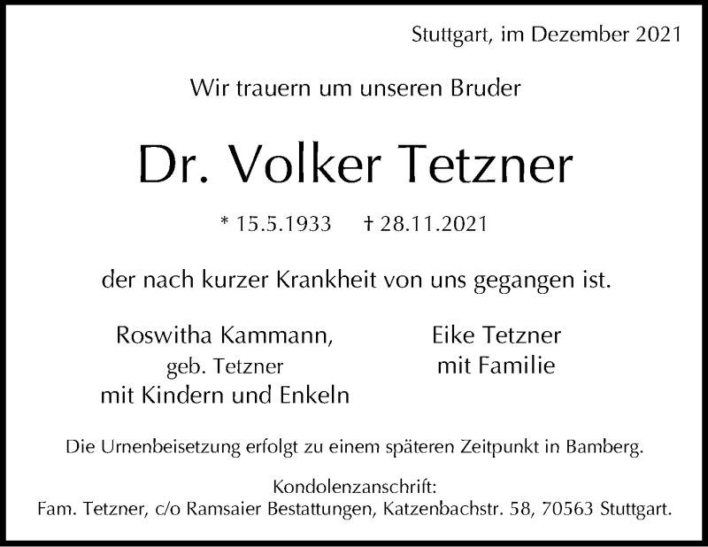 Hier finden Sie alle Traueranzeigen aus der Zeitung, die bisher für Volker Tetzner erschienen sind. Weitere Traueranzeigen, die in der Zeitung erscheinen, werden hier ebenfalls aufgelistet