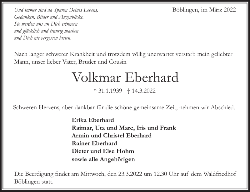 Hier finden Sie alle Traueranzeigen aus der Zeitung, die bisher für Volkmar Eberhard erschienen sind. Weitere Traueranzeigen, die in der Zeitung erscheinen, werden hier ebenfalls aufgelistet