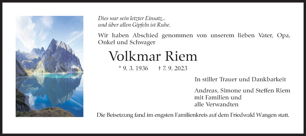 Hier finden Sie alle Traueranzeigen aus der Zeitung, die bisher für Volkmar Riem erschienen sind. Weitere Traueranzeigen, die in der Zeitung erscheinen, werden hier ebenfalls aufgelistet