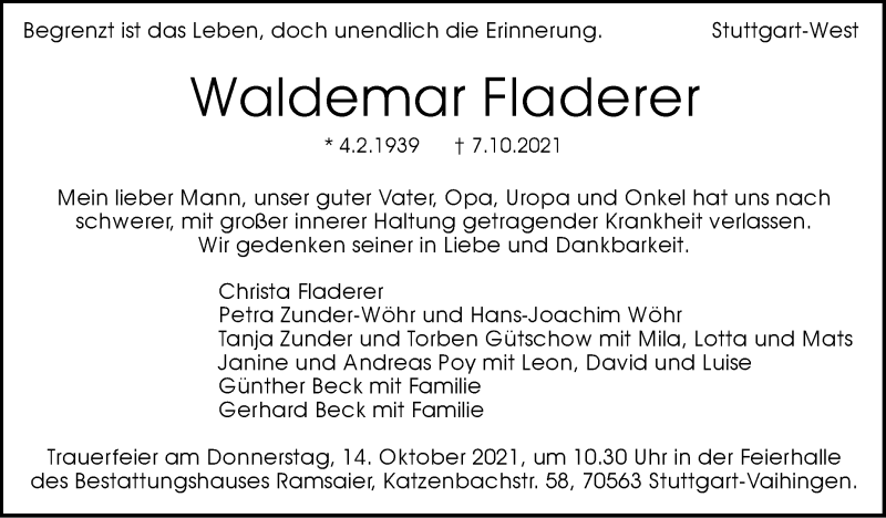 Hier finden Sie alle Traueranzeigen aus der Zeitung, die bisher für Waldemar Fladerer erschienen sind. Weitere Traueranzeigen, die in der Zeitung erscheinen, werden hier ebenfalls aufgelistet