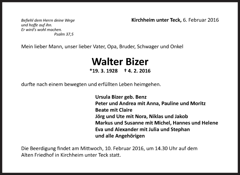 Hier finden Sie alle Traueranzeigen aus der Zeitung, die bisher für Walter Bizer erschienen sind. Weitere Traueranzeigen, die in der Zeitung erscheinen, werden hier ebenfalls aufgelistet