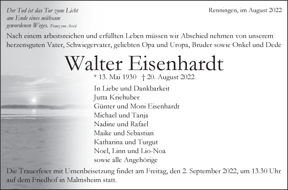 Hier finden Sie alle Traueranzeigen aus der Zeitung, die bisher für Walter Eisenhardt erschienen sind. Weitere Traueranzeigen, die in der Zeitung erscheinen, werden hier ebenfalls aufgelistet