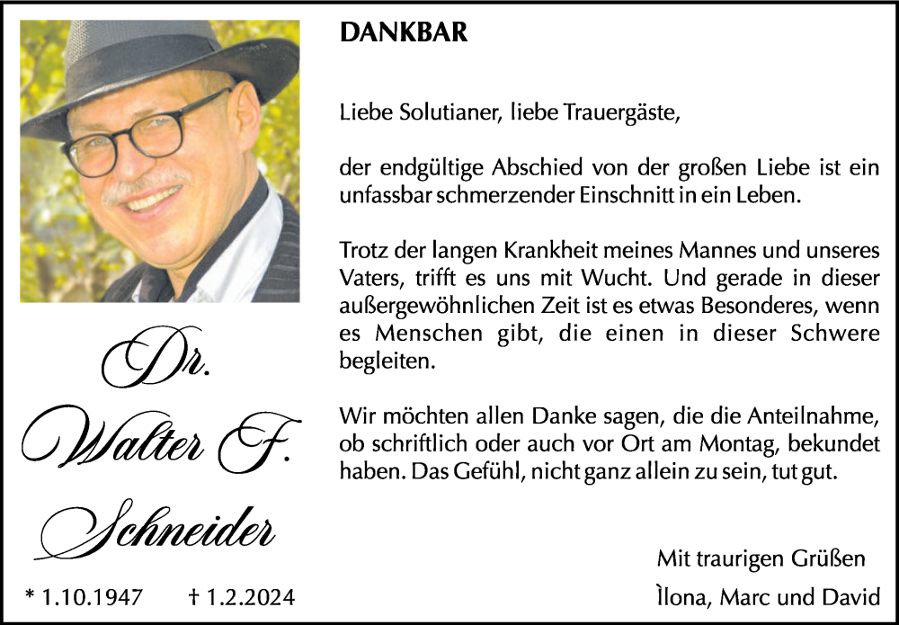 Hier finden Sie alle Traueranzeigen aus der Zeitung, die bisher für Walter F. Schneider erschienen sind. Weitere Traueranzeigen, die in der Zeitung erscheinen, werden hier ebenfalls aufgelistet