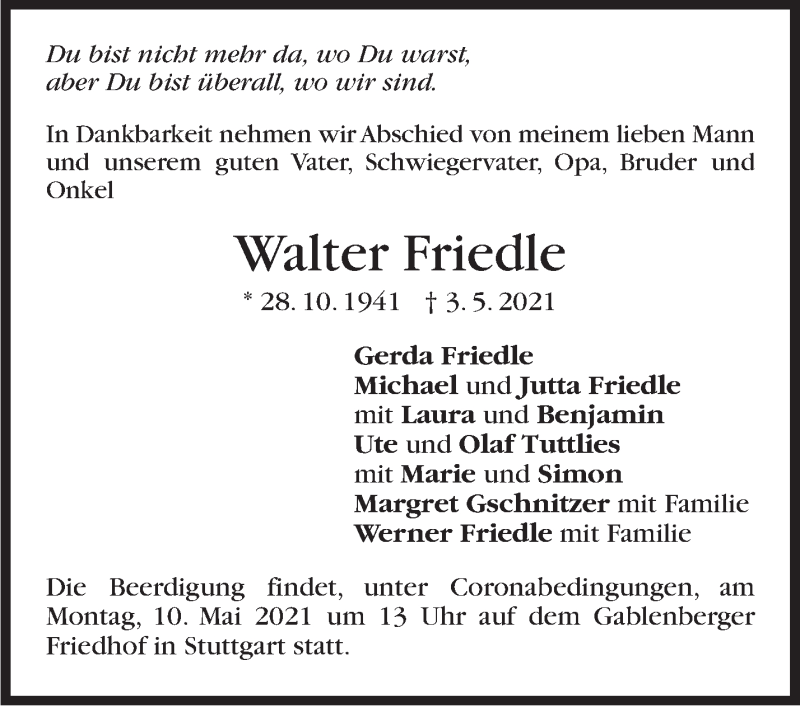 Hier finden Sie alle Traueranzeigen aus der Zeitung, die bisher für Walter Friedle erschienen sind. Weitere Traueranzeigen, die in der Zeitung erscheinen, werden hier ebenfalls aufgelistet