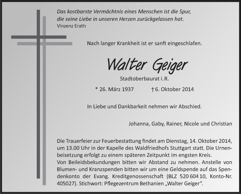 Hier finden Sie alle Traueranzeigen aus der Zeitung, die bisher für Walter Geiger erschienen sind. Weitere Traueranzeigen, die in der Zeitung erscheinen, werden hier ebenfalls aufgelistet