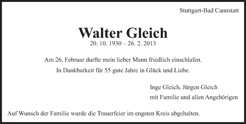 Hier finden Sie alle Traueranzeigen aus der Zeitung, die bisher für Walter Gleich erschienen sind. Weitere Traueranzeigen, die in der Zeitung erscheinen, werden hier ebenfalls aufgelistet