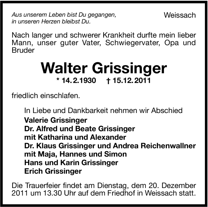 Hier finden Sie alle Traueranzeigen aus der Zeitung, die bisher für Walter Grissinger erschienen sind. Weitere Traueranzeigen, die in der Zeitung erscheinen, werden hier ebenfalls aufgelistet
