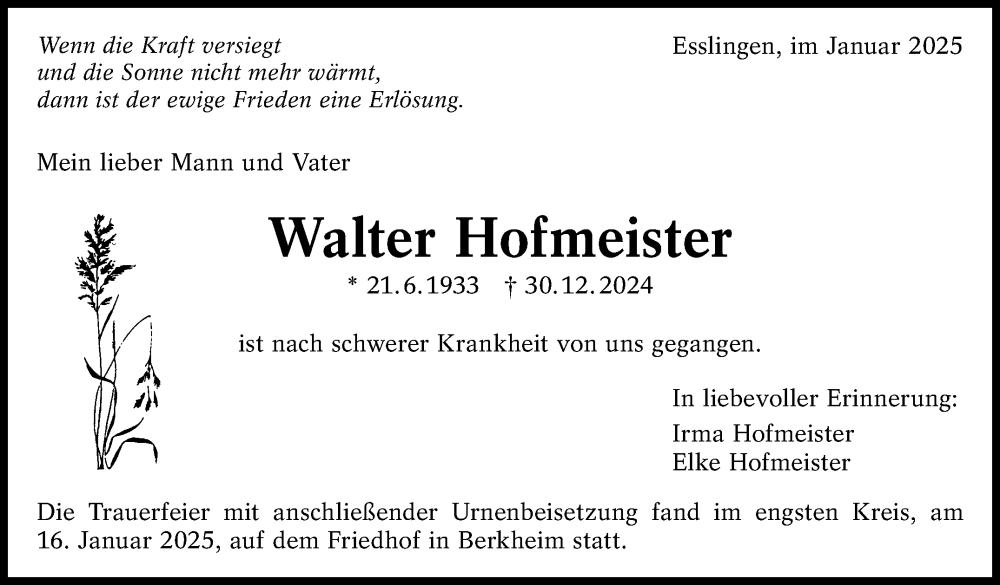 Hier finden Sie alle Traueranzeigen aus der Zeitung, die bisher für Walter Hofmeister erschienen sind. Weitere Traueranzeigen, die in der Zeitung erscheinen, werden hier ebenfalls aufgelistet