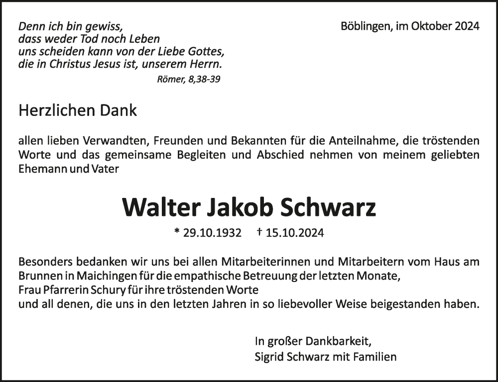 Hier finden Sie alle Traueranzeigen aus der Zeitung, die bisher für Walter Jakob Schwarz erschienen sind. Weitere Traueranzeigen, die in der Zeitung erscheinen, werden hier ebenfalls aufgelistet