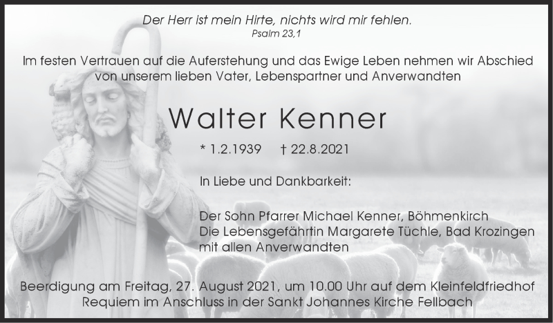 Hier finden Sie alle Traueranzeigen aus der Zeitung, die bisher für Walter Kenner erschienen sind. Weitere Traueranzeigen, die in der Zeitung erscheinen, werden hier ebenfalls aufgelistet