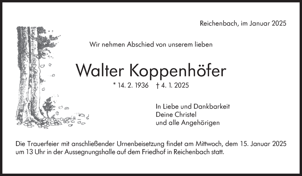 Hier finden Sie alle Traueranzeigen aus der Zeitung, die bisher für Walter Koppenhöfer erschienen sind. Weitere Traueranzeigen, die in der Zeitung erscheinen, werden hier ebenfalls aufgelistet