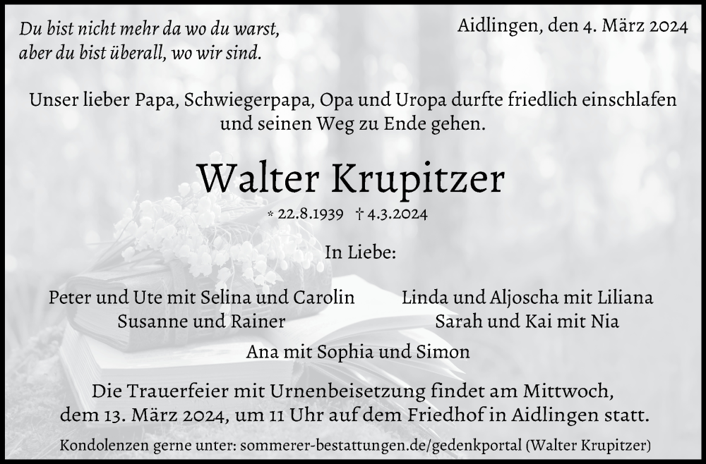Hier finden Sie alle Traueranzeigen aus der Zeitung, die bisher für Walter Krupitzer erschienen sind. Weitere Traueranzeigen, die in der Zeitung erscheinen, werden hier ebenfalls aufgelistet