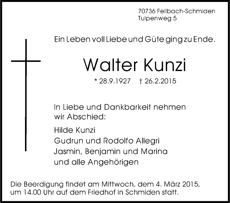 Hier finden Sie alle Traueranzeigen aus der Zeitung, die bisher für Walter Kunzi erschienen sind. Weitere Traueranzeigen, die in der Zeitung erscheinen, werden hier ebenfalls aufgelistet