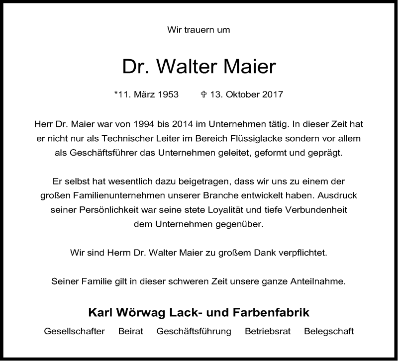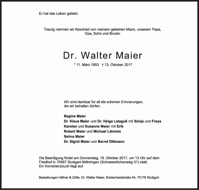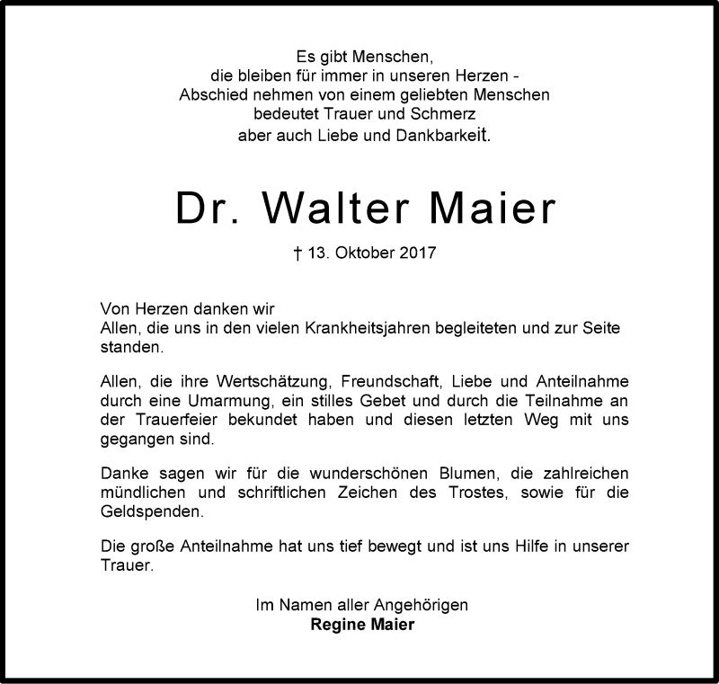Hier finden Sie alle Traueranzeigen aus der Zeitung, die bisher für Walter Maier erschienen sind. Weitere Traueranzeigen, die in der Zeitung erscheinen, werden hier ebenfalls aufgelistet