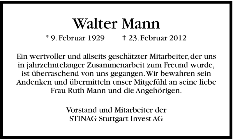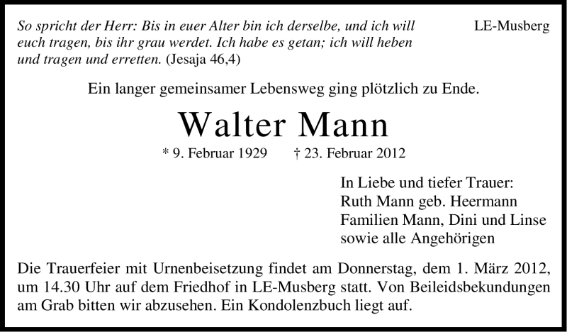 Hier finden Sie alle Traueranzeigen aus der Zeitung, die bisher für Walter Mann erschienen sind. Weitere Traueranzeigen, die in der Zeitung erscheinen, werden hier ebenfalls aufgelistet