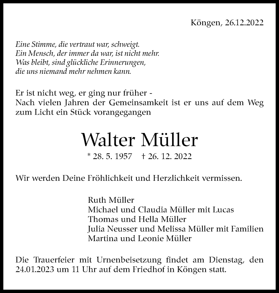 Hier finden Sie alle Traueranzeigen aus der Zeitung, die bisher für Walter Müller erschienen sind. Weitere Traueranzeigen, die in der Zeitung erscheinen, werden hier ebenfalls aufgelistet