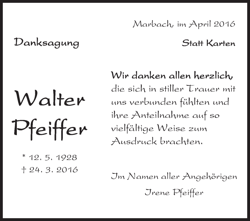 Hier finden Sie alle Traueranzeigen aus der Zeitung, die bisher für Walter Pfeiffer erschienen sind. Weitere Traueranzeigen, die in der Zeitung erscheinen, werden hier ebenfalls aufgelistet